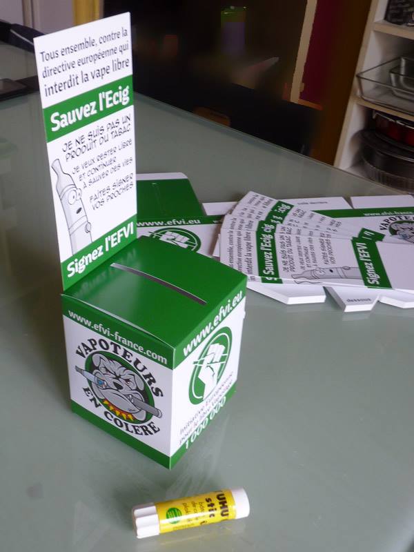 Le mouvement EFVI, dont le but est récolter un million de signatures avant le 25 novembre 2014, et atteindre un quota minimum dans sept états membres, reste aujourd’hui l’unique moyen légal de faire entendre la voix des vapoteurs européens auprès des instances politiques. L’idée principale étant de récolter assez de signatures pour demander à l’Europe de réétudier sa copie de la Directive sur les produits du tabac, elle qui inclut le vaporisateur personnel dans le même cadre réglementaire.