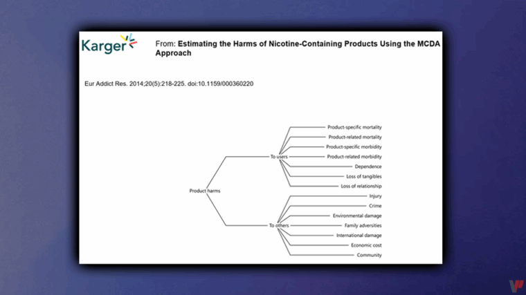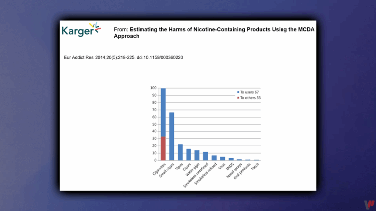 La recherche ayant établi que la vape serait « environ 95 % moins nocive que le tabagisme » a été publiée en 2014 dans European Addiction Research sous le titre Estimating the Harms of Nicotine-Containing Products Using the MCDA Approach1.