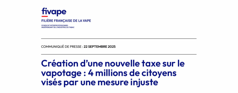 Le 22 septembre, la FIVAPE a réagi au travers d’un communiqué de presse. S’inquiétant de l’urgence dans laquelle vont devoir être votés les projets de loi de finances 2026 (PLF et PLFSS), dont la date butoir est le 13 octobre, elle s’émeut de la possibilité d’une reprise de cette mesure de taxation « in extenso pour gagner du temps, nous obligeant, comme l’an dernier, à livrer bataille contre une hérésie sanitaire. »
