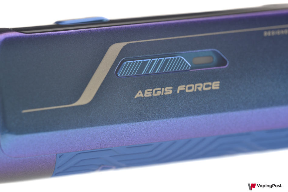 Avec 183 g sur la balance, le kit Aegis Force en impose. Situé entre le kit classique et le gros pod, l’Aegis Force est simple puisqu’un seul bouton en façade complète l’écran. Il permet de naviguer dans les menus et de les valider. Sans aucune complexité, le kit est idéal pour se lancer dans la vape directe.