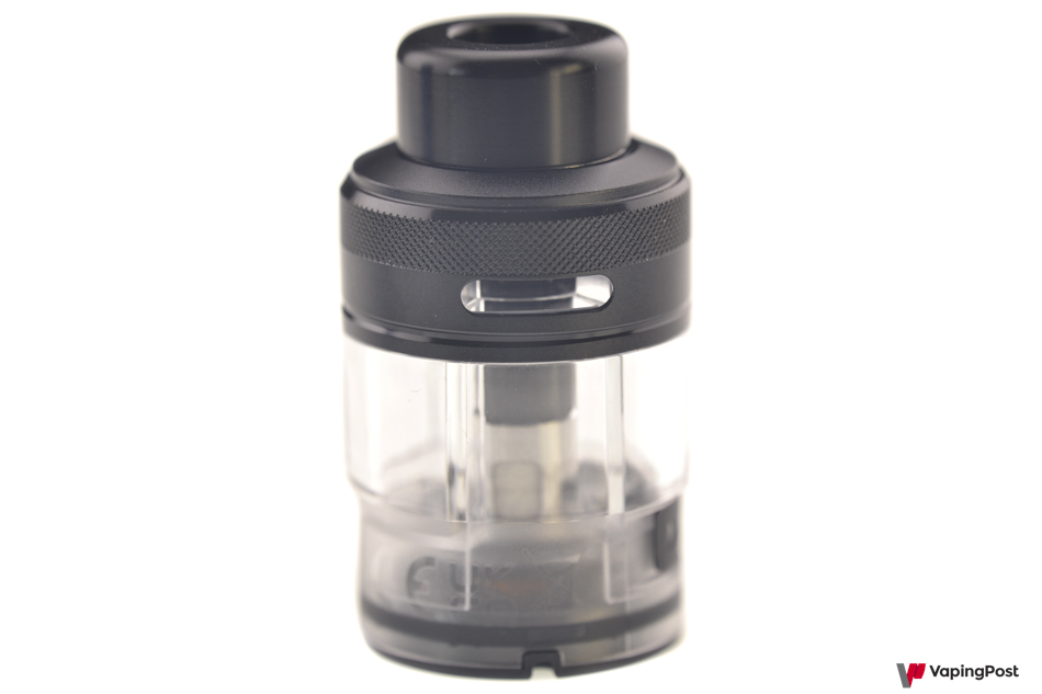Le réservoir fourni dans le kit a une contenance de 5 ml. Il accueille des résistances amovibles. Le remplissage s’effectue par le bas, en soulevant l’opercule en silicone souple. Le réservoir est fourni avec deux drip tips adaptés à un tirage direct ou indirect, car l’Aegis Force est compatible avec les résistances B MTL pour une vape plus discrète. Le réglage de l’airflow se fait directement sur le réservoir à son sommet par un système de bague rotative.