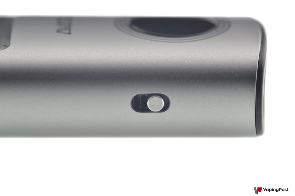 Sur un côté du pod, une glissière ajuste le niveau d’air qui refroidit la résistance de la cartouche et impacte également sur la sensation de tirage. Plus la glissière laisse passer d’air et plus le tirage est aérien en restant toujours dans le champ de l’inhalation directe très restreinte. Inversement, moins d’air entre dans le pod et plus le tirage est serré. La vapeur est, alors, un peu plus tiède.
