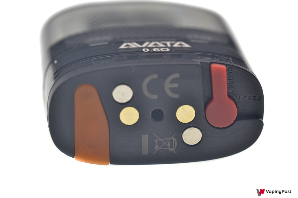 Sous la cartouche, l’orifice de remplissage est situé sous l’opercule en silicone orange. Il est suffisamment grand pour accepter la plupart des embouts de flacon d’e-liquide. Une petite pièce rouge contrôle, quant à elle, l’ouverture et la fermeture du passage entre les deux parties du réservoir.