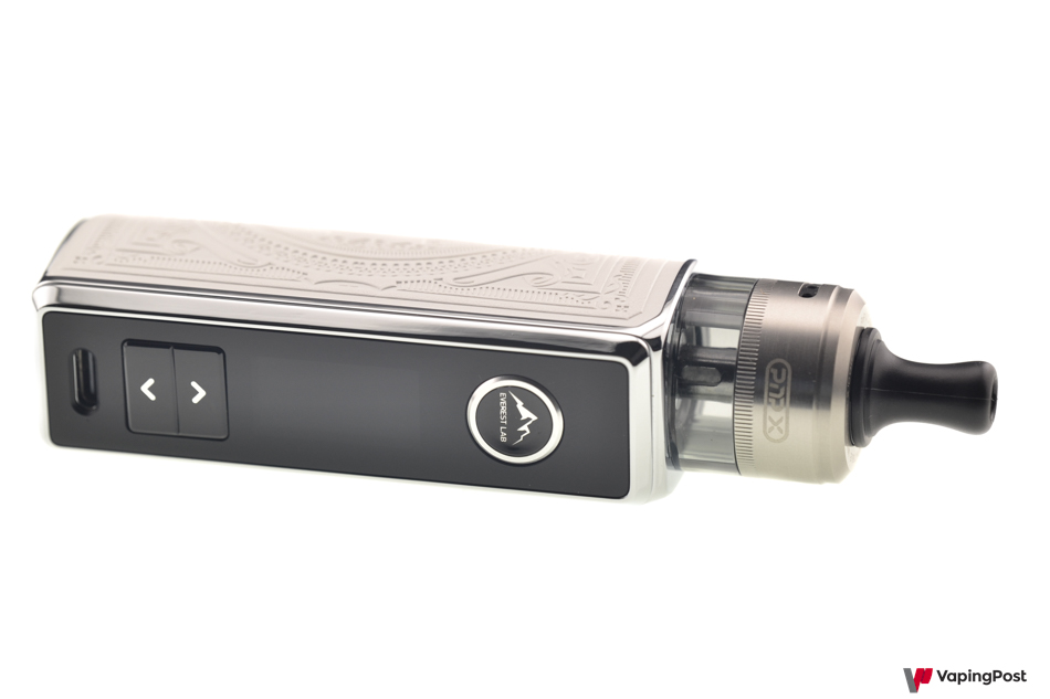 La façade principale du Drag S3 comprend un bouton de déclenchement circulaire. Il est signé Everest Lab, la section recherche et développement du fabricant. Hormis ce logo, il présente la particularité d’être tactile et équipé d’un capteur capacitif. Le contact avec le doigt  déverrouille instantanément le pod. À l’inverse, le pod se verrouille automatiquement quand on retire son doigt du bouton.