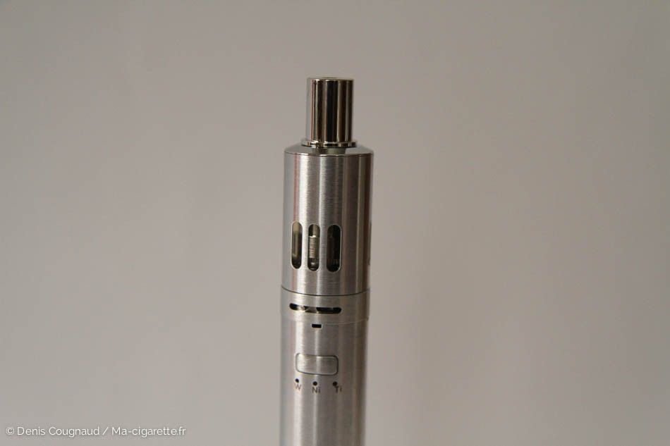 Après 5 pressions sur le bouton, une micro led s’éclaire juste en dessous du Fire, c’est fin, classe et pas trop voyant ! Cette micro led s’allume quand on vape et montre le taux de remplissage de votre accu. La couleur varie selon le mode sélectionné. En revanche pour sélectionner le mode vous devez, batterie éteinte, par un appui long choisir le mode W-TI-NI qui est ………….. caché par votre pouce ! En effet si vous voulez voir les leds vous devrez venir appuyer sur le fire par le haut. Etonnant raté de la part de Joyetech et ce d’autant plus que la solution était toute trouvée avec la version Mega en décalant ces leds sur la gauche ou sur la droite.