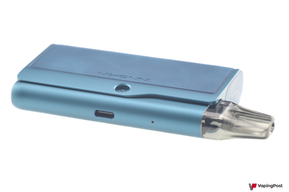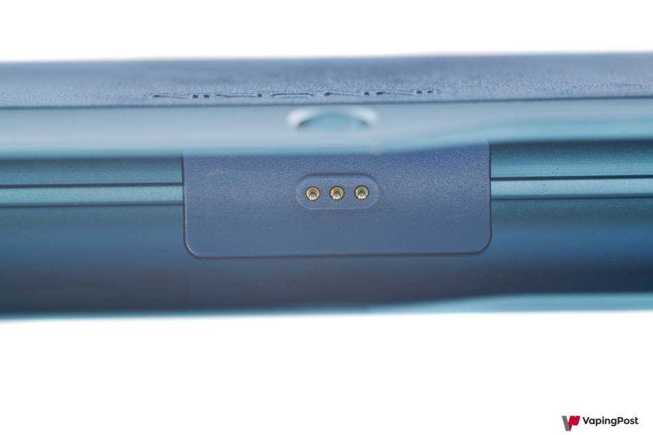 Sur le pod, aucun bouton de déclenchement n’est présent, puisqu’il fonctionne par simple inhalation. Lors de nos tests, nous n’avons pas remarqué de latence perceptible entre inhalation et production de vapeur. La batterie du pod a une autonomie de 400 mAh, un chiffre dans la moyenne des dispositifs de ce format. Il est possible de vapoter pendant le rechargement.