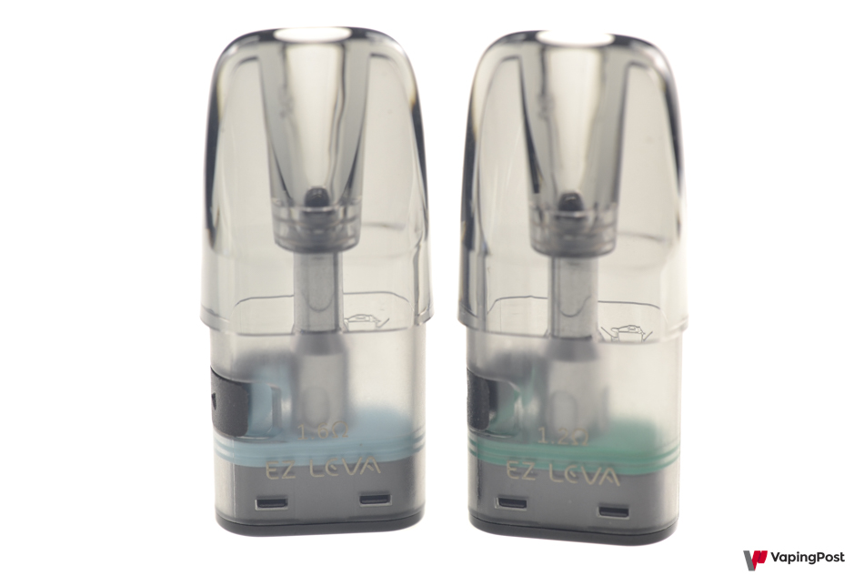 Deux cartouches sont fournies dans le kit. Une EZ Leva de 1,2 ohm et une contenance de 2,5 ml, et une seconde EZ Leva de 1,6 ohm. On comprend immédiatement que le pod est prévu exclusivement pour une vape MTL bien serrée. À noter que le pod ne délivre pas plus de 13 W au maximum.