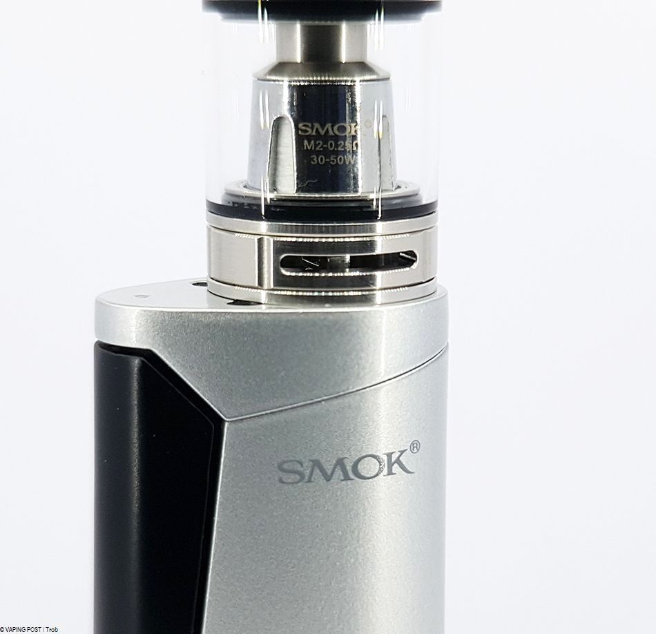 Surmontée du TFV8 Baby, je regrette quand même que Smok nous ait de nouveau inclus ce clearomiseur comme sur de nombreux kits du fabricant. Non pas que le Baby soit mauvais, il demeure un des meilleurs clearomiseur de cette année, mais ses 22 mm de diamètre ne font pas très élégants sur cette box qui est en 24,5 mm de largeur. Pourquoi ne pas nous avoir livré un Big Baby ou mieux, un X-Baby ? Esthétiquement, on ne peut pas dire que l’effet soit des plus réussis.