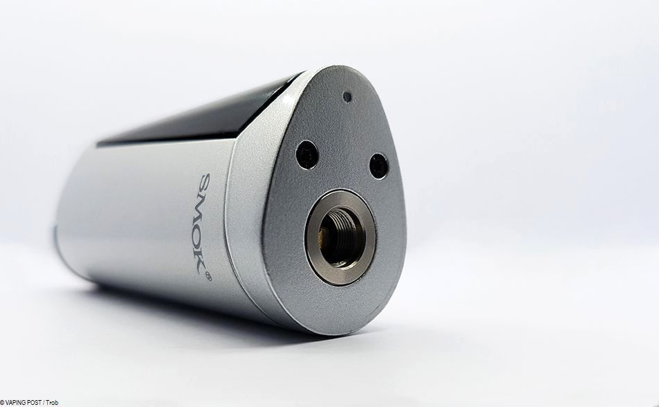 Tout en haut de la Priv V8, on trouve bien évidemment le connecteur prêt à recevoir votre atomiseur. Le pin 510 en laiton est monté sur ressort et un petit joint tout au fond empêchera le liquide d’aller visiter l’intérieur de la box. À l’opposé, une toute petite LED vous donnera une indication en cas de dysfonctionnement. Les protections proposées par la Priv V8 sont exactement les mêmes que n’importe quelle autre box électronique, et le nombre de clignotements indiquera ce qui se passe :