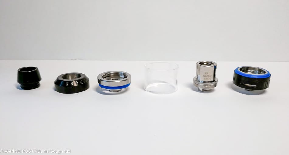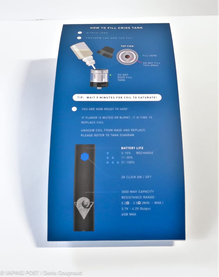 Attention : le Crios est simple de fonctionnement, mais il faudra être franchement vigilant sur un point. Cette vigilance lui fait d’ailleurs perdre une étoile d’office. En effet il ne faut absolument pas visser trop fort le top cap noir après le remplissage. Si vous ne faites pas attention, vous dévissez alors tout l’ensemble, car la résistance est elle aussi vissée au top cap. Et là catastrophe tout votre liquide s’enfuit, car le tank est juste soutenu par vissage de cette résistance sur la base.