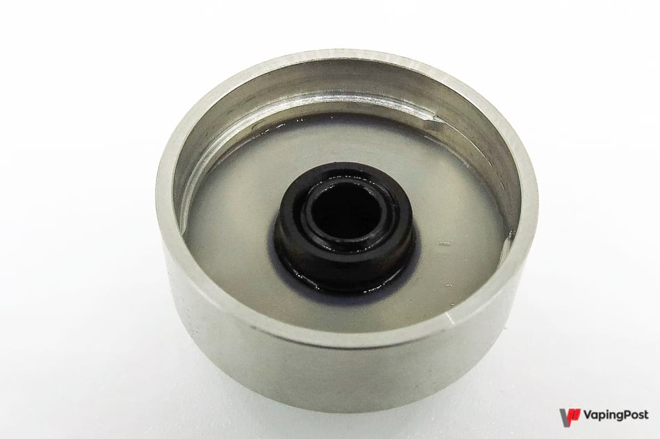 Une impressionnante ouverture d’air flow s’ouvre sous la résistance, permettant une vape très aérienne orientée cloud chasing. De 4 mm de large, elle suffira amplement à refroidir les coils les plus acrobatiques, d’autant qu’avec 7 mm d’espace entre les posts, il y a de quoi faire. Cette entrée d’aire est contrôlée par une bague d’air flow efficace, mais limitée par la taille du perçage.