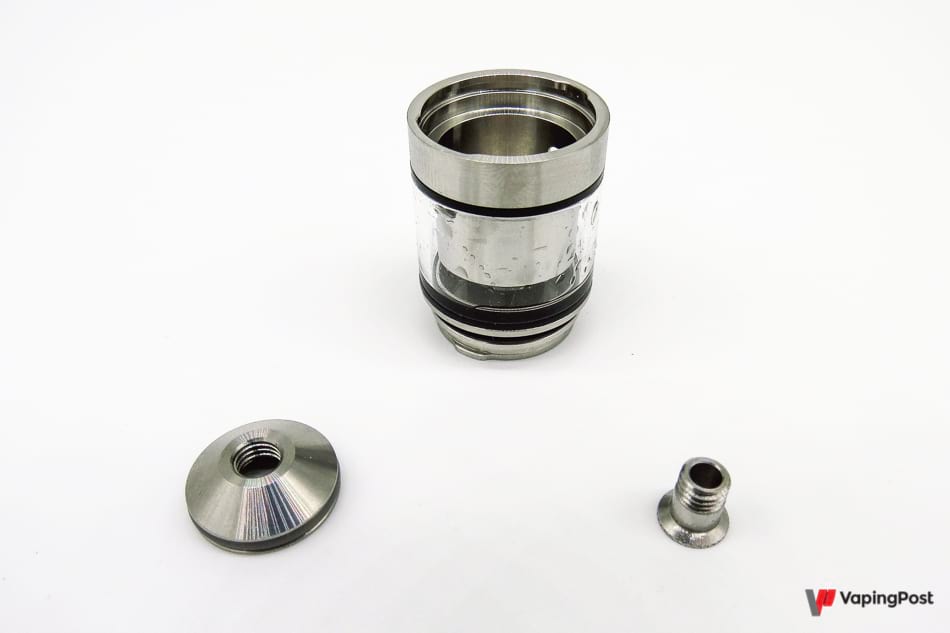 Autre astuce, la chambre d’atomisation. Assez grande, elle se voit adjoindre une pièce qui sert de réducteur, elle même fixée par une vis percée qui réduit le diamètre de la cheminée. Ceci, pour adapter la chambre d’atomisation et la cheminée à son type de vape. Mais le coup de maître est ailleurs : besoin de refroidir votre vapeur pour des fruités ? Retirez la chambre d’atomisation, et la température baisse en flèche. Envie d’un gourmand ? Remettez là en place, et vous aurez une vape chaude dans une chambre réduite où votre coil aura quand même de la place.