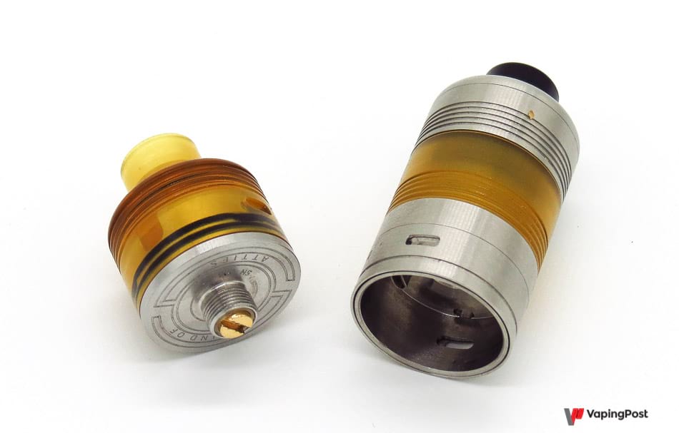 Les finitions sont remarquables, comme on pouvait s’y attendre de la part du créateur de la Mellody Box, et c’est heureux, parce qu’ici, on est au royaume du pile. Il faudra placer le tank pile au bon endroit sur la base, mais deux petits détrompeurs vous y aideront et le maintiendront ensuite pour que vous puissiez tourner la bague d’airflow. Les réducteurs d’airflow MTL s’insèrent pile dans les ouvertures latérales, de l’intérieur. Cette opération demandera un peu de dextérité, mais le fait de pouvoir aisément enlever le plot positif sera d’un grand secours.