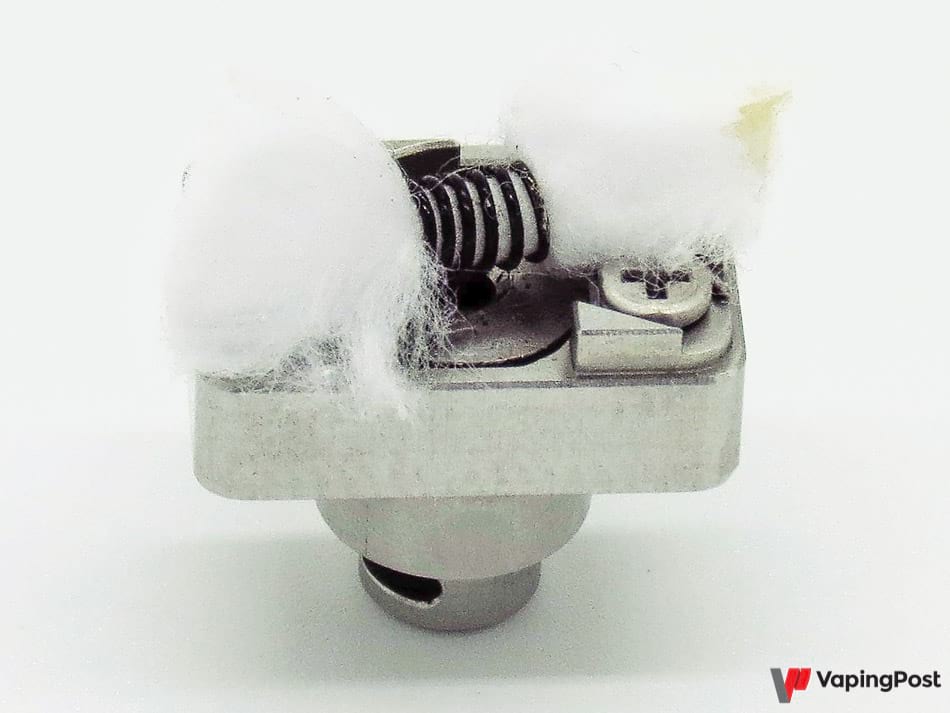 La mise en place est simplissime : une fois votre résistance préparée, elle vient se positionner de travers, avec une vis de chaque côté pour y fixer les pattes. Des petites renforts en acier aident à caler le fil. Une fois la résistance en place, il suffit de placer le coton, et de découper proprement ce qui dépasse en suivant les rebords du plateau, ce qui donne au final une mèche taillée en pointe, qu’il suffit de glisser dans les encoches prévues à cet effet.