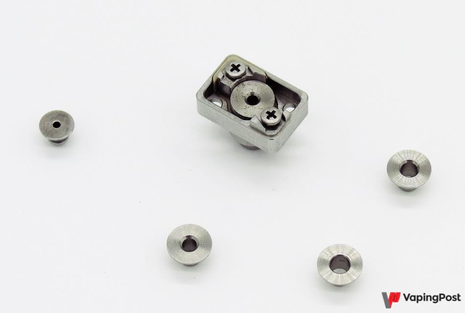 Atmizone a fait le choix du réducteur d’air flow interchangeable placé sous la résistance, le meilleurs compromis à l’heure actuelle. Et le choix est vaste : avec trois réducteurs supplémentaires en option, destiné au MTL, la gamme complète vous permettra d’aller de 1 à 4 millimètres d’ouverture. Et nous verrons plus loin que ce n’est pas un gadget.